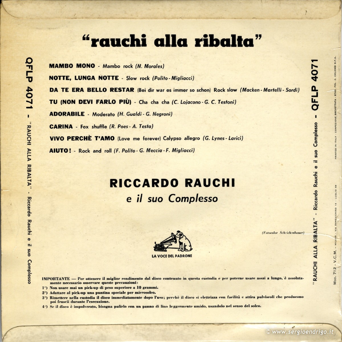 • Disco accreditato a “Riccardo Rauchi e il Suo Complesso” di cui Endrigo era al momento la voce solista e il contrabbasista